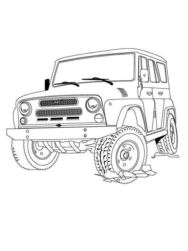 Распечатайте понравившиеся раскраски УАЗ для мальчиков. Черно-белые картинки-раскраски автомобилей УАЗ в хорошем качестве и примеры как раскрасить.