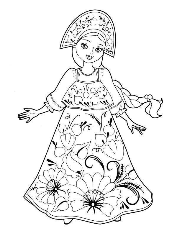 Распечатайте понравившиеся раскраски русский народный костюм для детей. Черно-белые картинки-раскраски русский народный костюм в хорошем качестве и примеры как раскрасить.